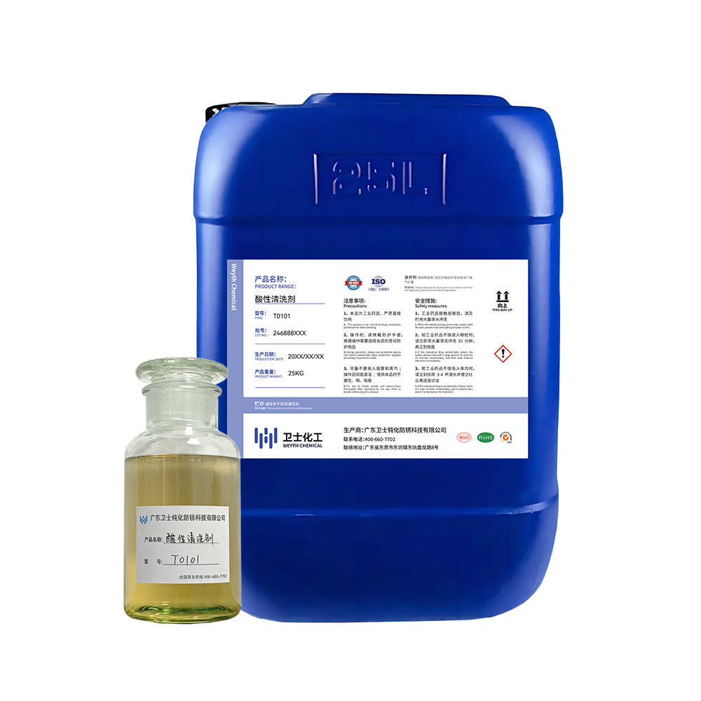 酸性清洗剂(T0101)用于不锈钢、铜合金等金属制品的除油,除灰除油除蜡除锈的清洗产品,由有机酸、表面活性剂、缓蚀钝化剂等复配而成,不含重金属,符合欧盟排放标准,绿色环保。能快速清除在研磨抛光、高温加工、焊接等工序在金属表面上的的抛光蜡、油泥垢、残留的焊斑及氧化皮,特别针对金属表面上难以清洗的位置(网状、深孔、缝隙)上的蜡垢、油污具有优异的清除效果,清洗能力强,不腐蚀基体,清洗后工件表面干净,无残留,并生成一 层保护膜,具有增亮增光的效果。