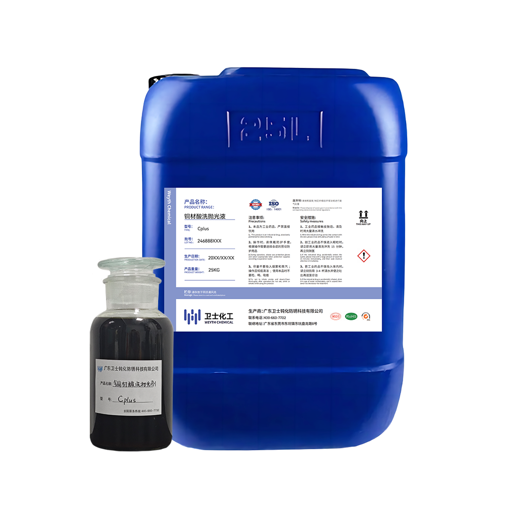 铜材酸洗抛光液(Cplus)特别适用于经过高温热处理的黄铜和紫铜的严重氧化皮的去除。 本产品不含铬酸和发烟硝酸,采用环保无机酸、无机高分子、高效铜离子螯合剂以及光亮剂复配而成。黄铜热处理产生的黑色氧化皮经过本品 3-5 分钟短时间的处理即可出光,亮度与铬酸盐体系抛光液处理相当,相比铬酸盐抛光液更绿色环保。